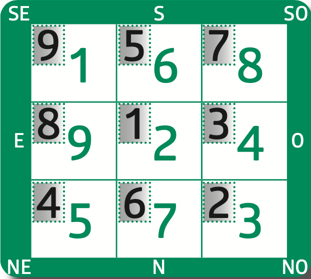 Chaque diagramme s’utilise de la même façon : dans chacune des 9 cases, vous trouverez 2 nombres. Le nombre dans le coin supérieur à gauche indique l’étoile mensuelle alors que le nombre au centre indique l’étoile annuelle. Utilisez une boussole fiable pour déterminer les directions, puis référez-vous aux carrés correspondants pour connaître les prévisions mensuelles pour chacun des secteurs. Pensez surtout à protéger ou à activer les zones qui comportent votre porte d’entrée et votre chambre à coucher !