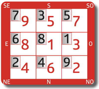 Chaque diagramme s’utilise de la même façon : dans chacune des 9 cases, vous trouverez 2 nombres. Le nombre dans le coin supérieur à gauche indique l’étoile mensuelle alors que le nombre au centre indique l’étoile annuelle. Utilisez une boussole fiable pour déterminer les directions, puis référez-vous aux carrés correspondants pour connaître les prévisions mensuelles pour chacun des secteurs. Pensez surtout à protéger ou à activer les zones qui comportent votre porte d’entrée et votre chambre à coucher !